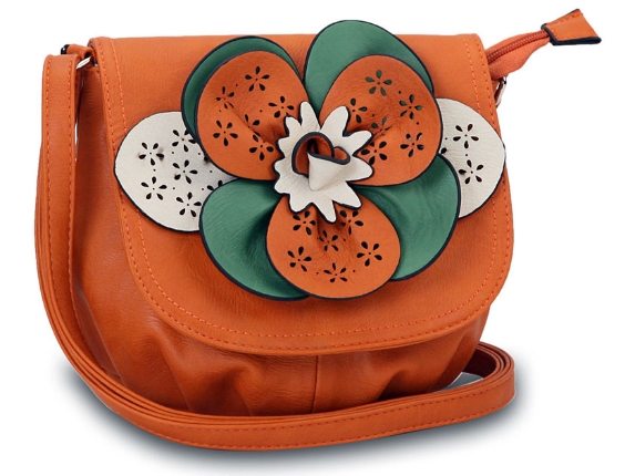 Faux leather crossbody small bag has a large floral detail with contrasting colors. Bag has an adjustable strap, top zipper closuer and front flap closure. Made of faux leather.