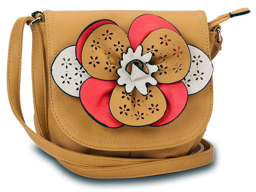 Faux leather crossbody small bag has a large floral detail with contrasting colors. Bag has an adjustable strap, top zipper closuer and front flap closure. Made of faux leather.