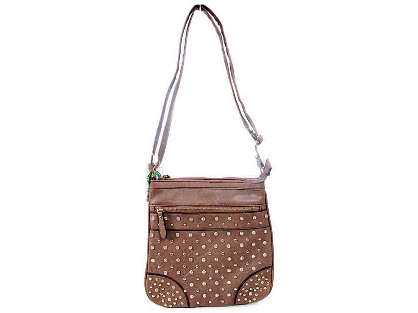 Faux Leather Metal studded messenger Bag. Front Pocket & top zipper closing. Back zipper pocket.