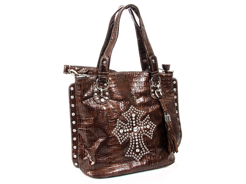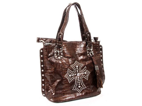 Crocodile Embossed PVC Rhinestones studded bag. Top zipper closing. Center divider, side zipper pocket and shoulder strap included.
