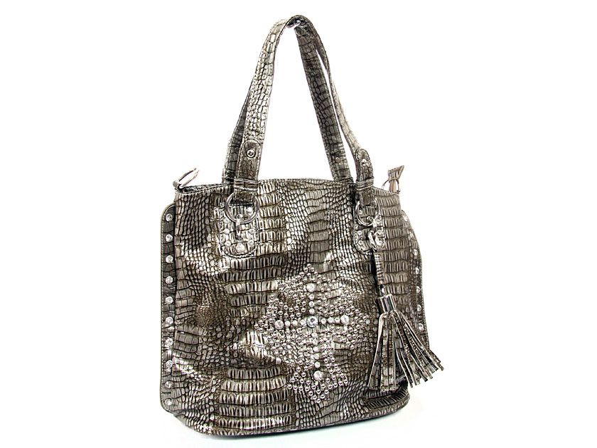 Crocodile Embossed PVC Rhinestones studded bag. Top zipper closing. Center divider, side zipper pocket and shoulder strap included.