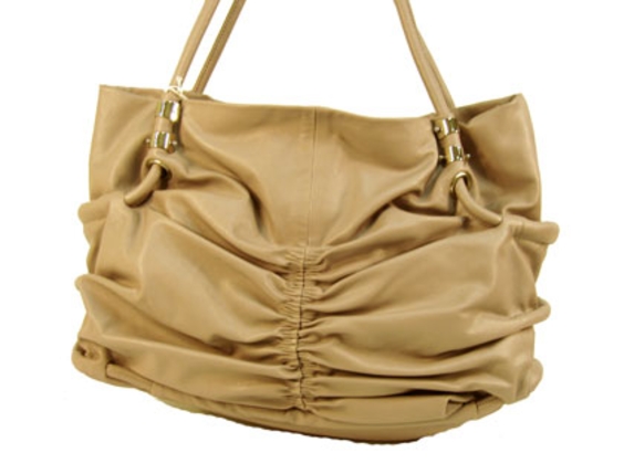 Spacious fashion shoulder bag has a ruched front, top zipper closure and a double handle. Made of PU.