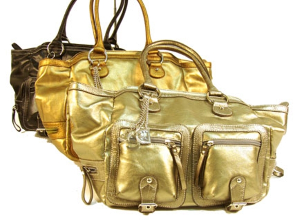 Trendy Shoulder Bag with multiple exterior pockets with zipper closure and a double handle. Bag has metallic texture, belts, chains, and zipper details. Made of PU (polyurethane)