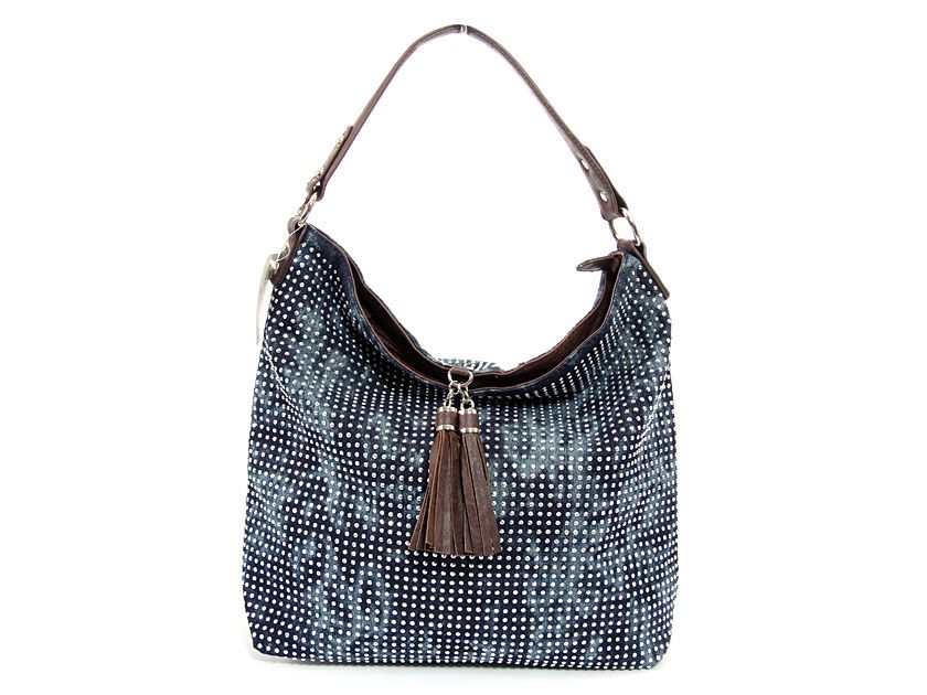 Metal Eyelets studded Denim Bag. Top zipper closing with a hanging tussle over it. Two zipper pockets inside the bag. Single shoulder strap.