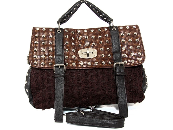 Medium size handbag has studded accents, twist lock closure, shrot handle, detachable shoulder strap and mini roses accents. Made of PVC.