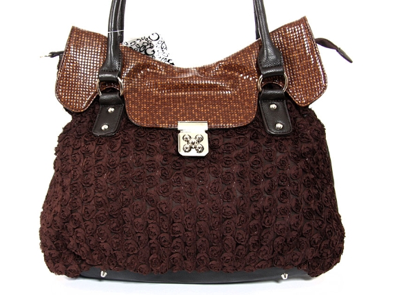 Shoulder bag is adorned with abstract fabric mini roses, has a double handle, top zipper closure and an elegant twist lock closure. Made of PVC.