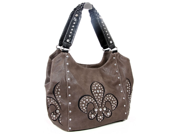 Rhinestones Studded PVC Fleur De Liz double handle bag. The bag has center divider, top zipper closing and side zipper pocket inside. Back zipper pocket.