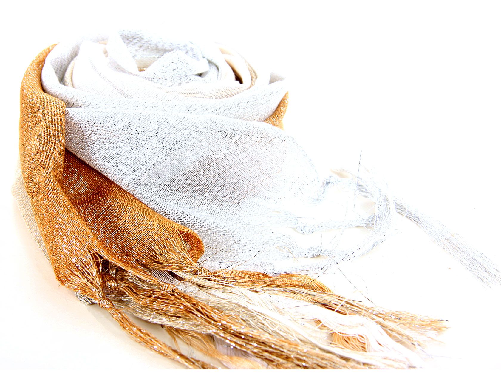 This lightweight 50% viscose & 50% polyester scarf in mustard, gold & white shades with silver stripes running through it can be used all year around to give an edge to your outfit. Long knotted tussels on its edges. Imported.