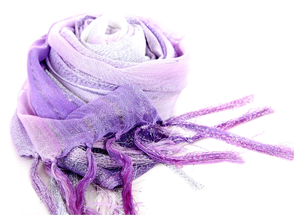This lightweight 50% viscose & 50% polyester scarf in purple, lilac & white shades with silver stripes running through it can be used all year around to give an edge to your outfit. Long knotted tussels on its edges. Imported.
