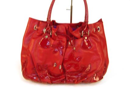 Trendy Handbag with drawstring closure & double handle has flowered applique details and ruched at bottom. Made of PU (polyurethane).