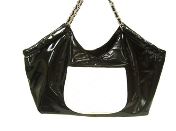 Trendy Hobo Shoulder Bag has a top zipper closure and a double chain handle. Bag has outisde pocket of different color. Made of PU (polyurethane).