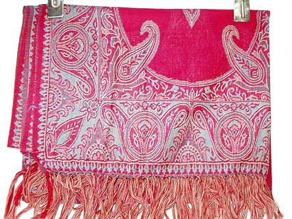 Fuchsia colored 100% Pure Wool Jamawar Shawl with paisley pattern in shades of green knitted into it. Fringes on the edges of the shawl. Imported.