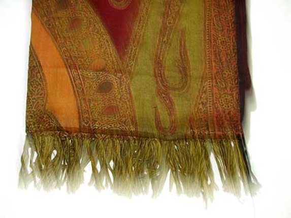 Multi Colored 100% Pure Wool Jamawar Shawl with shades of green, red & orange. Threads like fringes on the edges of the shawl. Imported.