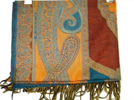 Teal colored 100% pure wool Jamawar shawl with shades of red & orange also. Artistically patterned with paisley shapes. Fringes on the edges. Imported.