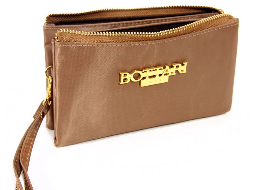 Nylon cosmetic wrist-let. Top zipper closing. Three separate compartments.