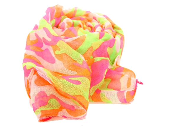 This army print polyester scarf in neon hot pink with shades of lime green & orange can be teamed up with a dress or shirt to suit any occasion in any kind of weather. Imported. Hand wash.