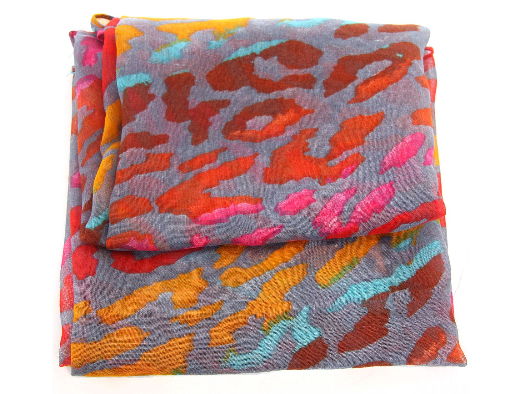 Semi-sheer grey polyester scarf with multi colored abstract print. Big size of the scarf makes it possible to be used as a shawl, wrap or scarf around the neck. Imported. Hand wash.