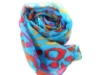 Semi-sheer turquoise blue polyester scarf with multi colored abstract print. Big size of the scarf makes it possible to be used as a shawl, wrap or scarf around the neck. Imported. Hand wash.