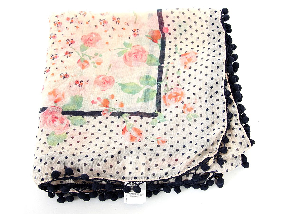 Miniature floral pattern in the middle with polka dots & floral border all along this square shaped scarf which can be used with any kind of outfit all year around. Round beads like lace all along its border.