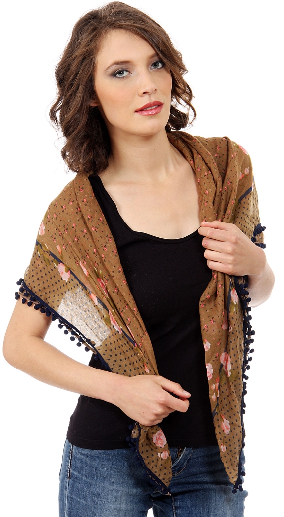Miniature floral pattern in the middle with polka dots & floral border all along this square shaped scarf which can be used with any kind of outfit all year around. Round beads like lace all along its border.