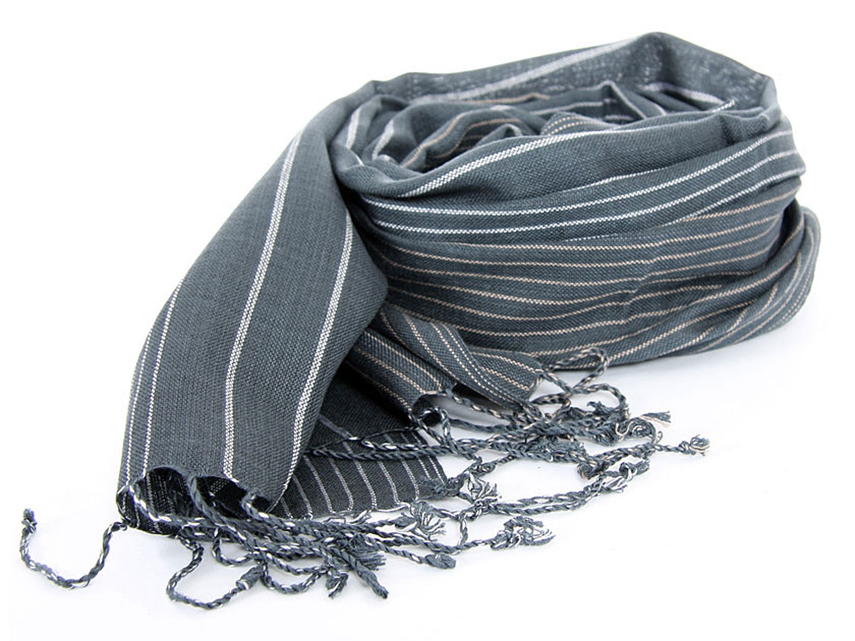 Grey colored yarn dyed 100% viscose scarf with white stripes running through it vertically. Thin twisted fringes on the ends of this comfy scarf. Imported.