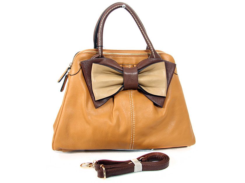 Bow accent dual compartment fashion handbag. Adjustable shoulder strap included. Back zipper pocket.