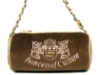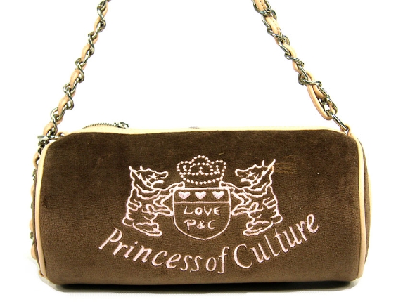 Suede Barrel Shape Fashion Handbag with "princess of culture" embroidery over it. PVC & chain twisted together make the shoulder strap. Top zipper closure.