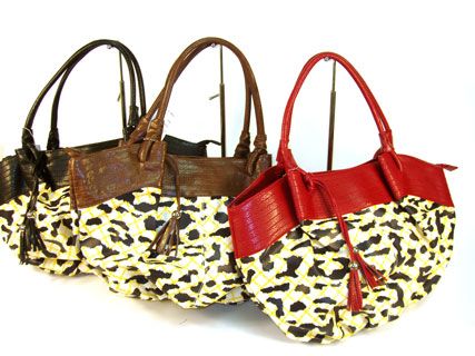 Trendy Shoulder bag with top zipper closure and a double handle has an animal print pattern design and a single color band with tassel detail. Made of faux leather.