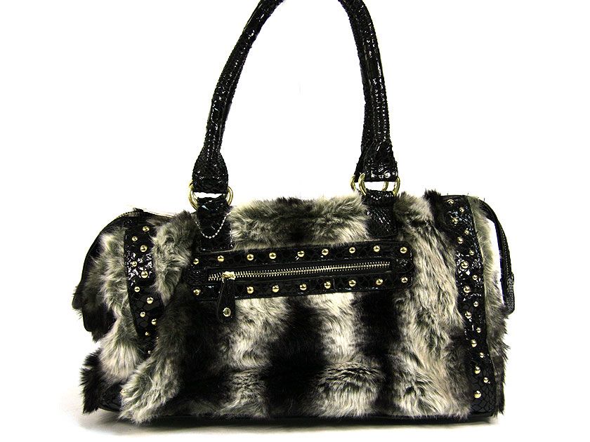 Faux Fur PU Fashion Handbag with Patent leather patchwork with studs over them. Double shoulder handle & zipper closure.
