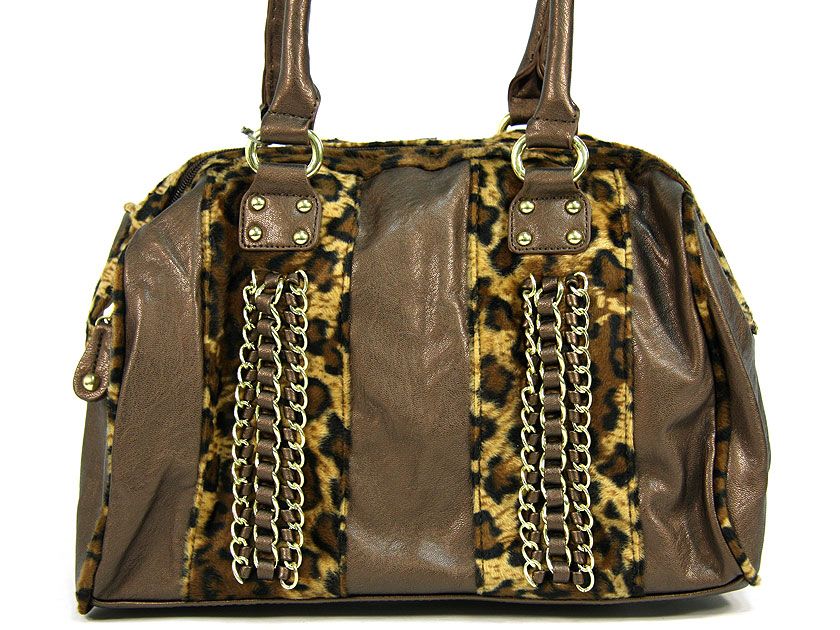 Shining PVC Shoulder bag with Leopard print patchwork with chain accents over them. Top zipper closure which has leopard print trim along it. Double shoulder handle.