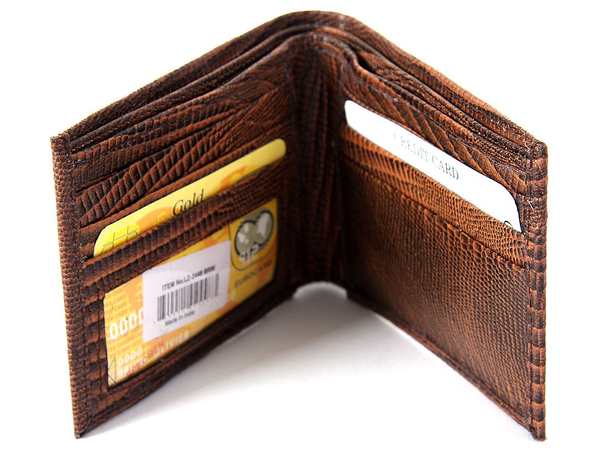 Carry your money in style. This is a lizard embossed genuine leather bi-fold mens wallet. As this is genuine leather, please be aware that there will be some small creases and nicks in the leather but the wallet are all brand new.