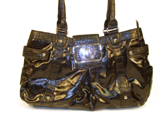 Trendy Handbag has an animal print pattern along straps and shiny leather like texture. Bag has a top zipper closure and belt flap with a twist lock closure. Bag has a double handle. Made of PU (polyurethane).