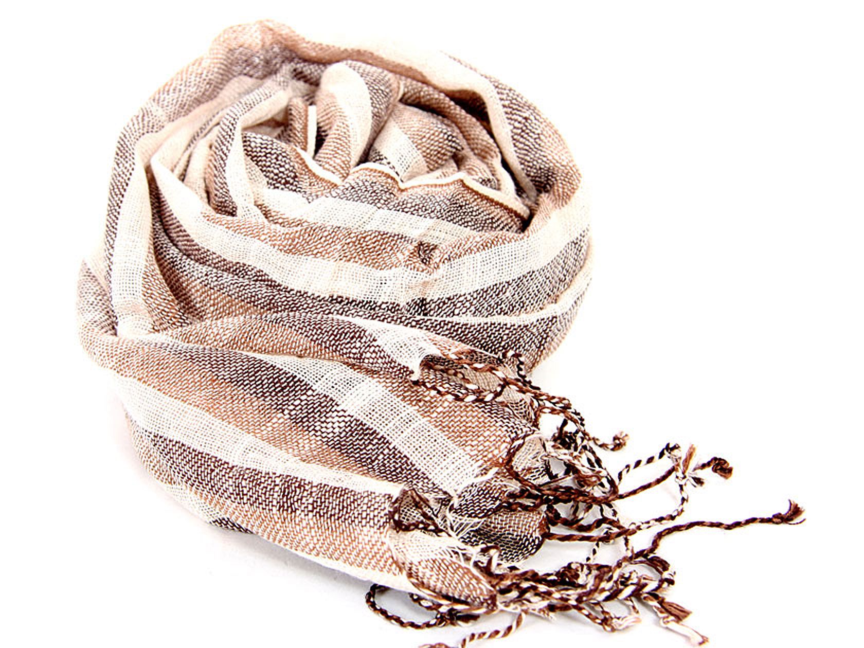 Lightweight & woven viscose scarf has earthy tones of brown & off-white. The scarf is made of yarn dyed viscose. Imported.