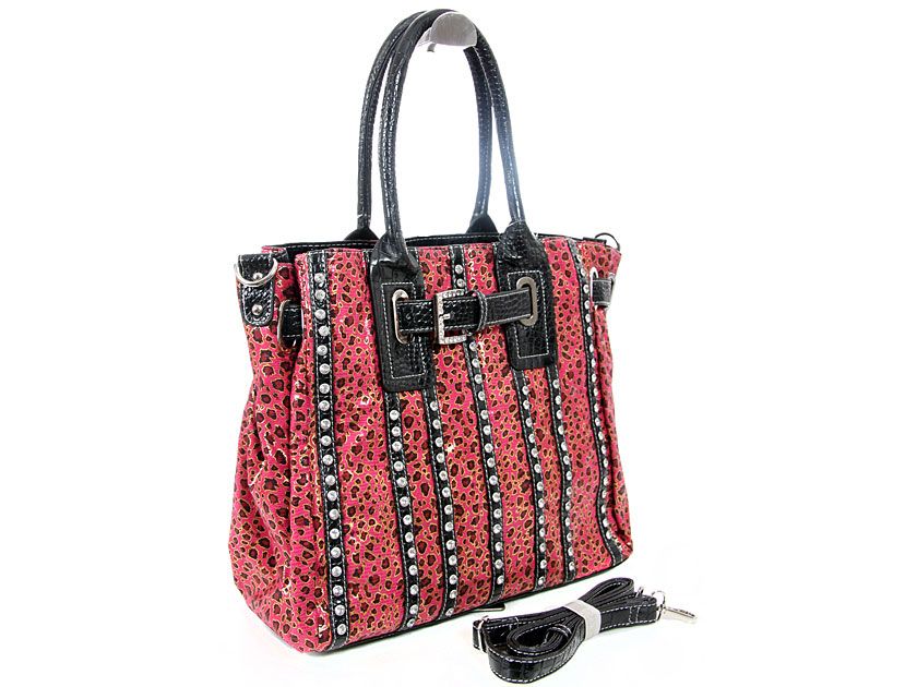 Animal Print Rhinestones studded bag. The bag has double handle, top zipper closing and adjustable shoulder strap.
