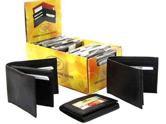 Assorted soft bi-fold and tri-fold lambskin wallets. The box containing dozen wallets converts into a counter display.