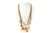 Beautiful gold tone multiple chains long necklace with hangings in different shapes & colors. Resin in red & yellow and gold tone love & leaf shape hangings. Five thin chains but in smaller length with two of them braided with thread add extra zing to this beautiful neck piece.