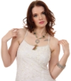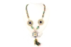 Tantalizing neck piece has colorful twisted thread as string with patterned round metal accents & metal pendant adorned with colored threads & stones. Colored threads & golden chains make a hanging tussel. Imported.