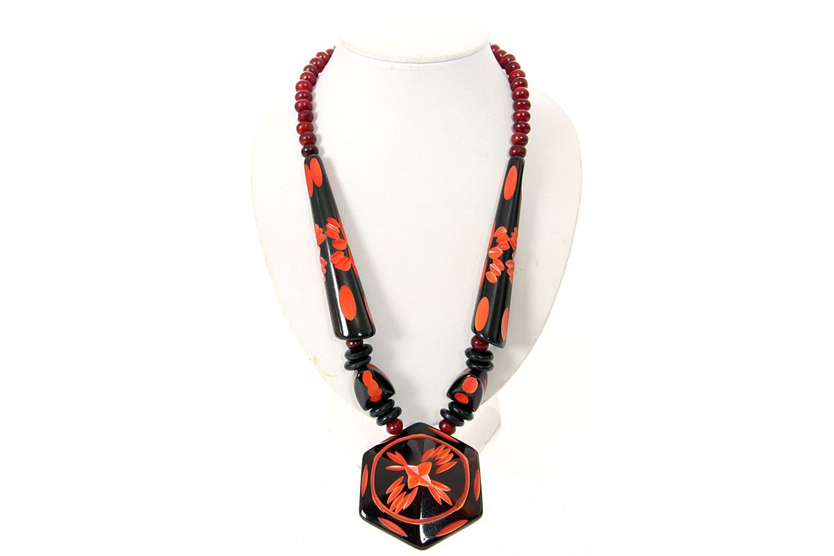 Chunky look black resin necklace with orange carved pattern. Hexagon shape drop pendant gives it a little tribal look. Imported.