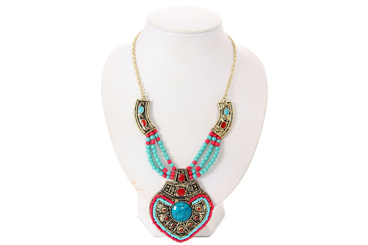 Royal look necklace made of gold tone metal & strands of resin beads has heart shape pendant in gold tone metal with engraved design & decorated with turquoise & red miniature beads. Gold tone chain at the ends with lobster closure completes this necklace.
