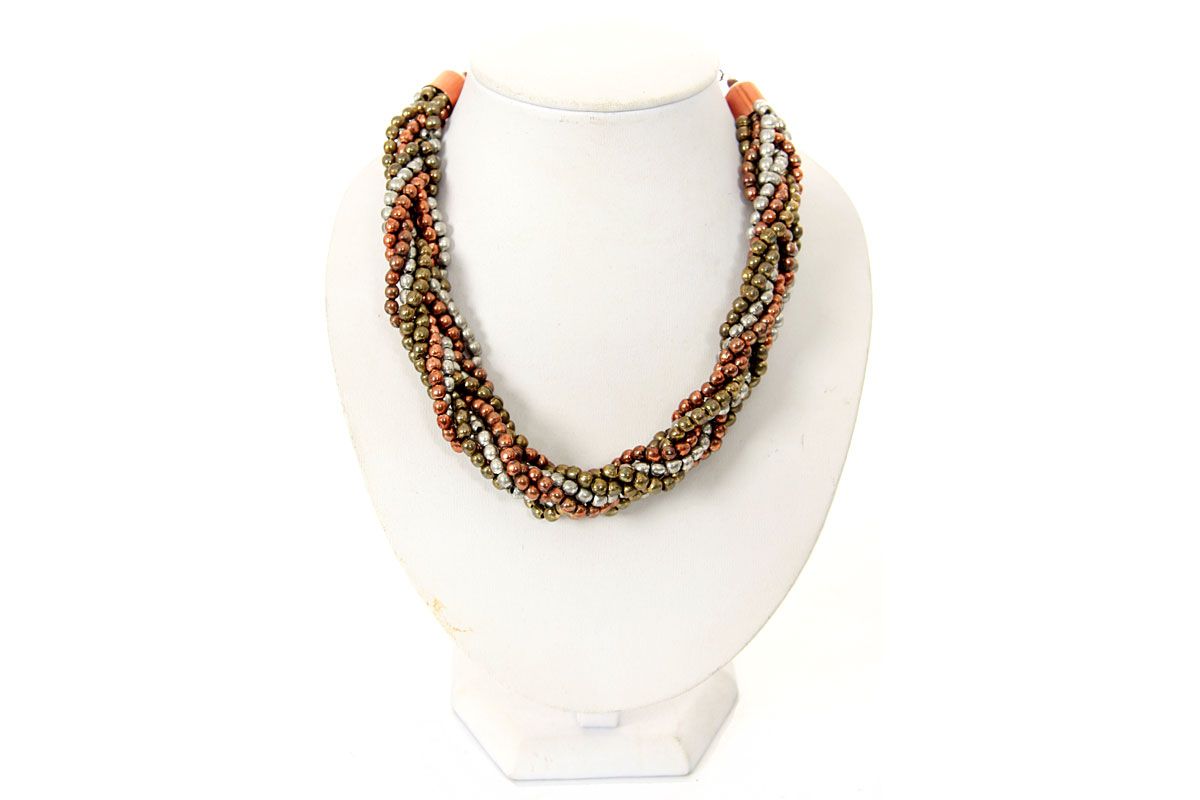 Strands of copper, bronze, silver beads are braided together to make a mesh design neck piece which is very elegant & matches lot of outfits. Copper color metal chain at both ends completes this beautiful collar necklace.
