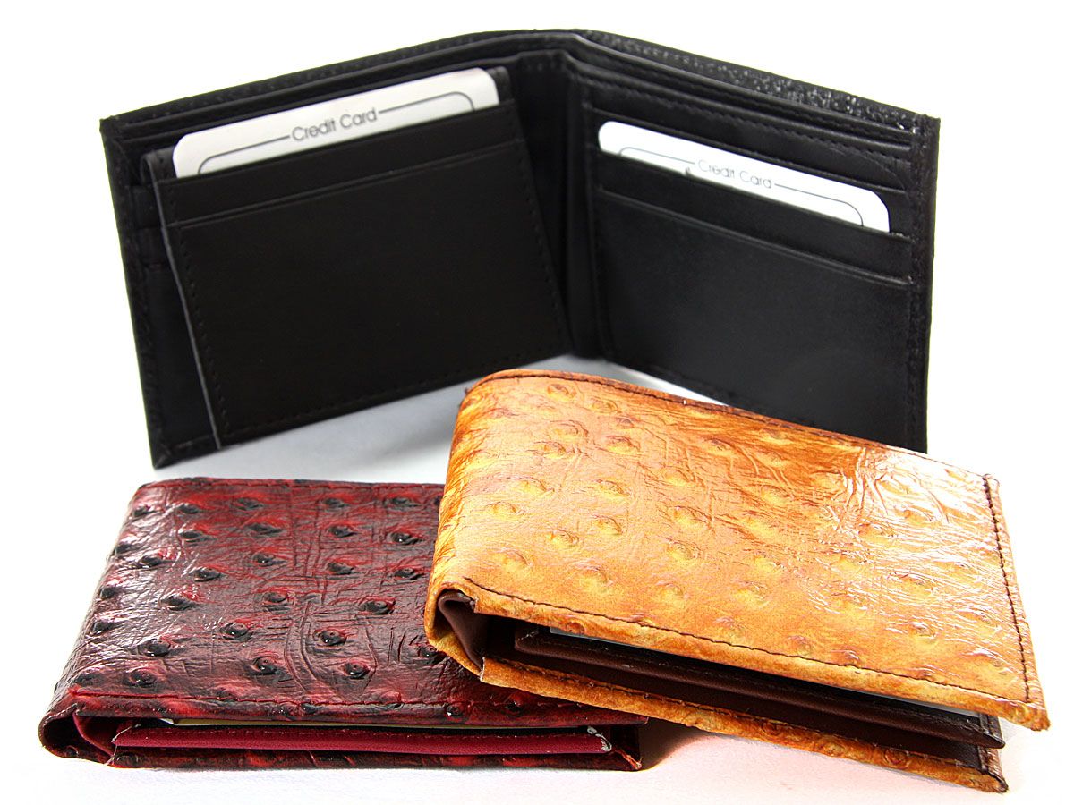 Carry your money in style. This is a Ostrich embossed genuine cow leather bifold mens wallet. The outside shell is genuine cow-hide leather and the inside is faux leather. As this is genuine leather, please be aware that there will be some small creases and nicks in the leather but the wallet are all brand new.