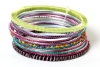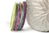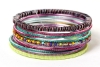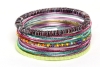 Colorful & lightweight 12 pieces bangles set can be matched with any kind of outfit. 9 thin glittery bangles, one thin beaded bangle & 2 threaded bangles - one lime green & one multi colored. Hand crafted in India.