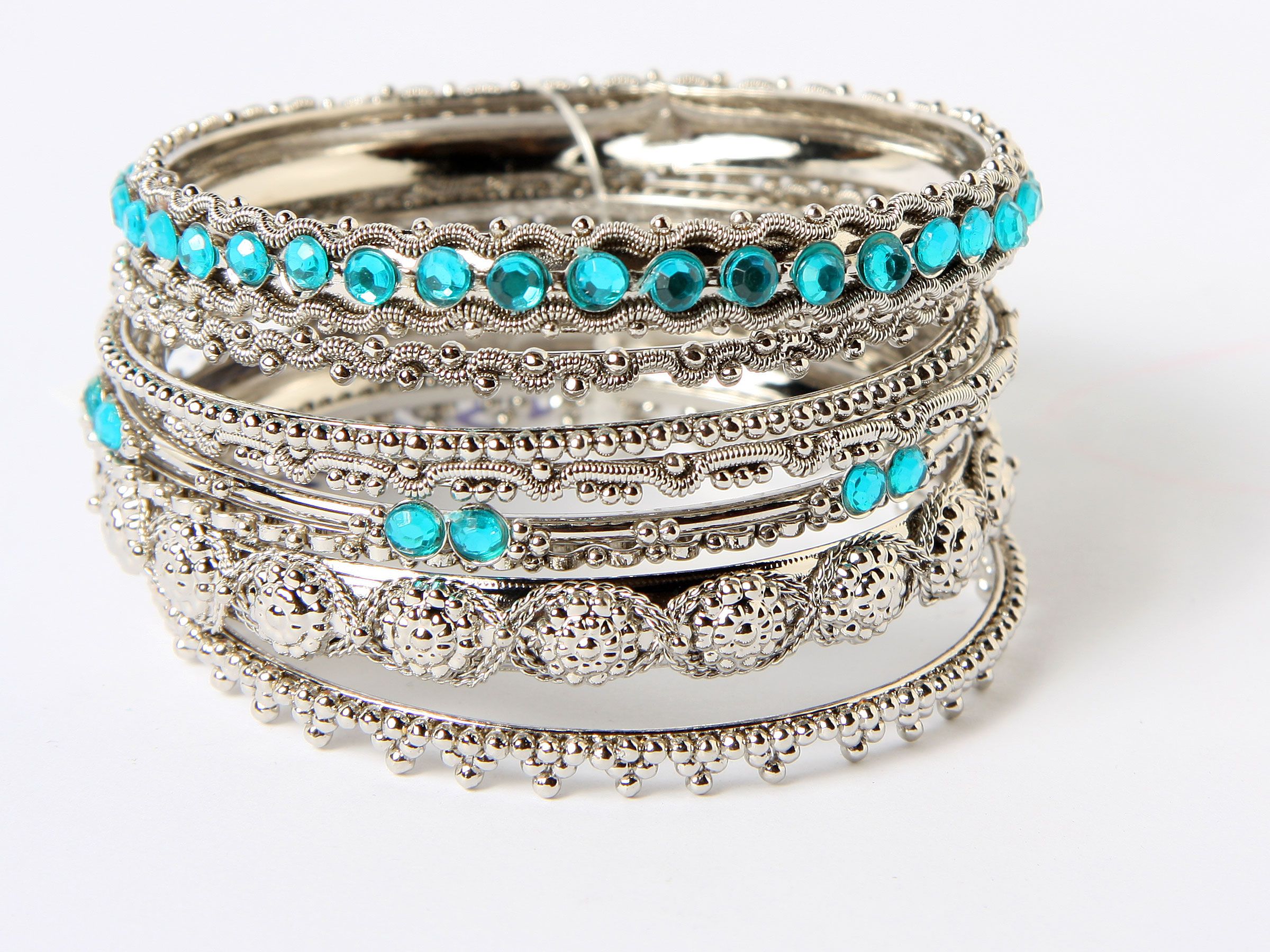 Beautifully hand crafted silver colored set of 8 fashion bangles in assorted widths & pattern. Each has its own metal pattern with one wide bangle having colored mirrors & also one thin bangle with colored mirrors. Expert craftsmanship reflects through this stylish set.