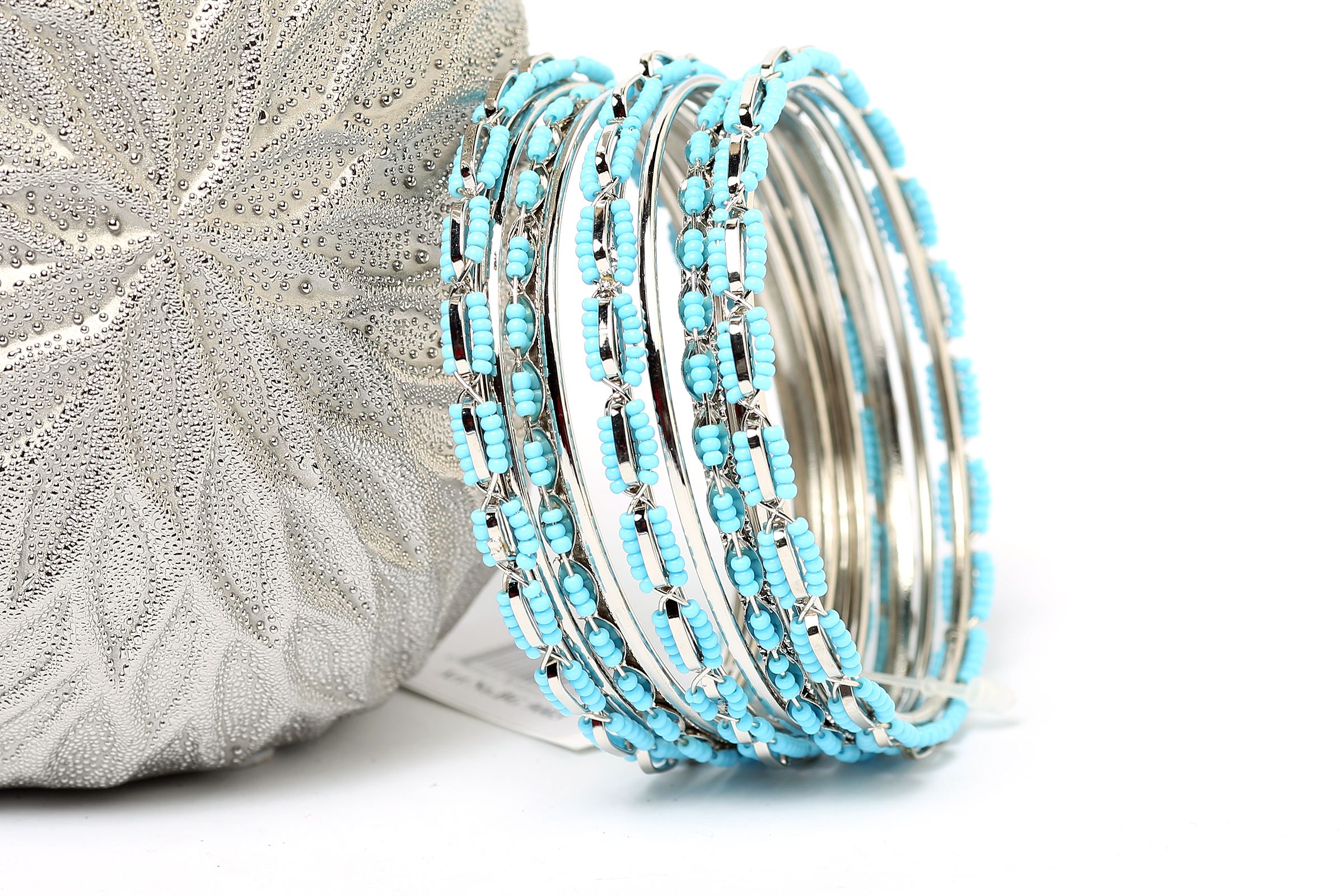 Turquoise Beads Silver Metal Fashion Bangles Set can add zing to any kind of outfit. Set includes 4 thin bangles, 2 petal patterned with beads and 3 bangles having beads in boxy shape. Durable & long lasting quality.