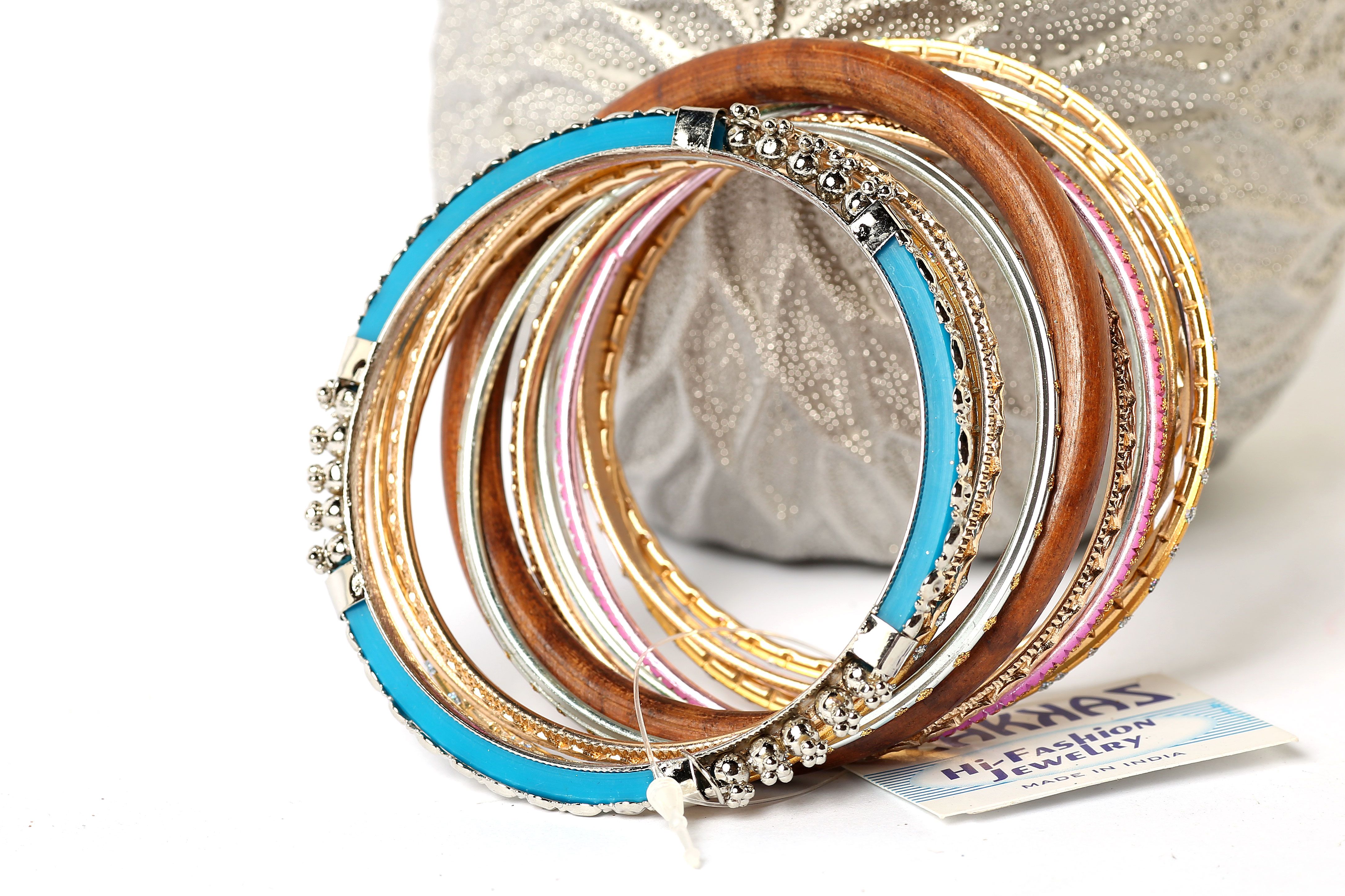 Colorful & Fashionable set of 13 Pieces includes a wooden bangle, a turquoise metal bangle with floral metal design & glittery thin bangles in resin material. Hand crafted & very lightweight.
