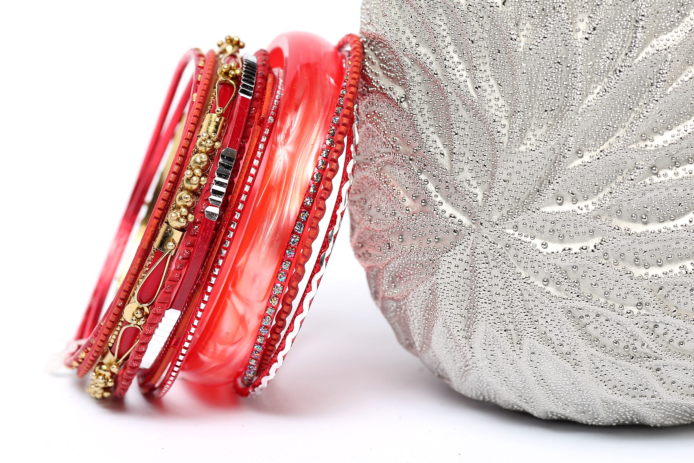 This assorted bangles set in coral color has 12 pieces including 1 resin bangle in bronze colored metal frame, 1 broad resin bangle & 10 thin resin bangles in different patterns. Can be worn all together as a set or individually. Hand crafted.