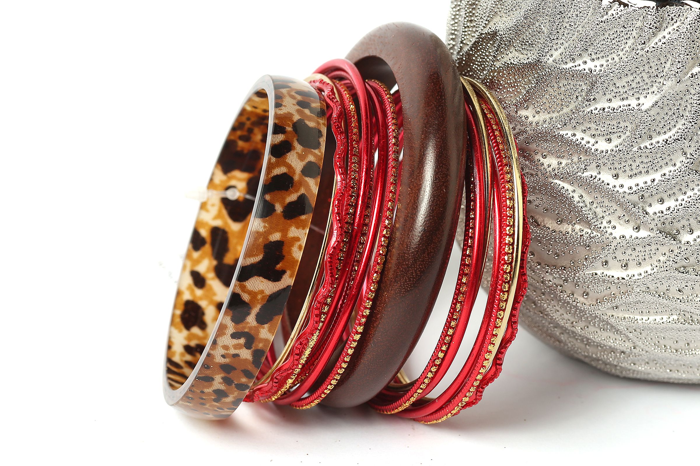 This fashion bangles set includes 16 pieces in total with 2 wide wooden bangles & 14 thin bangles. Thin bangles are plain as well as glittered. Ethnic as well as trendy look & can be matched with any kind of outfit.