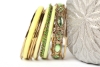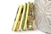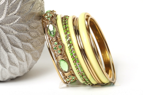Chunky looking assortment of 10 pieces including 4 thin bangles, 3 lime green resin bangles, 2 thin green bangles & one wide metal pattern bangle with green rhinestones on it. This set can light up any outfit.