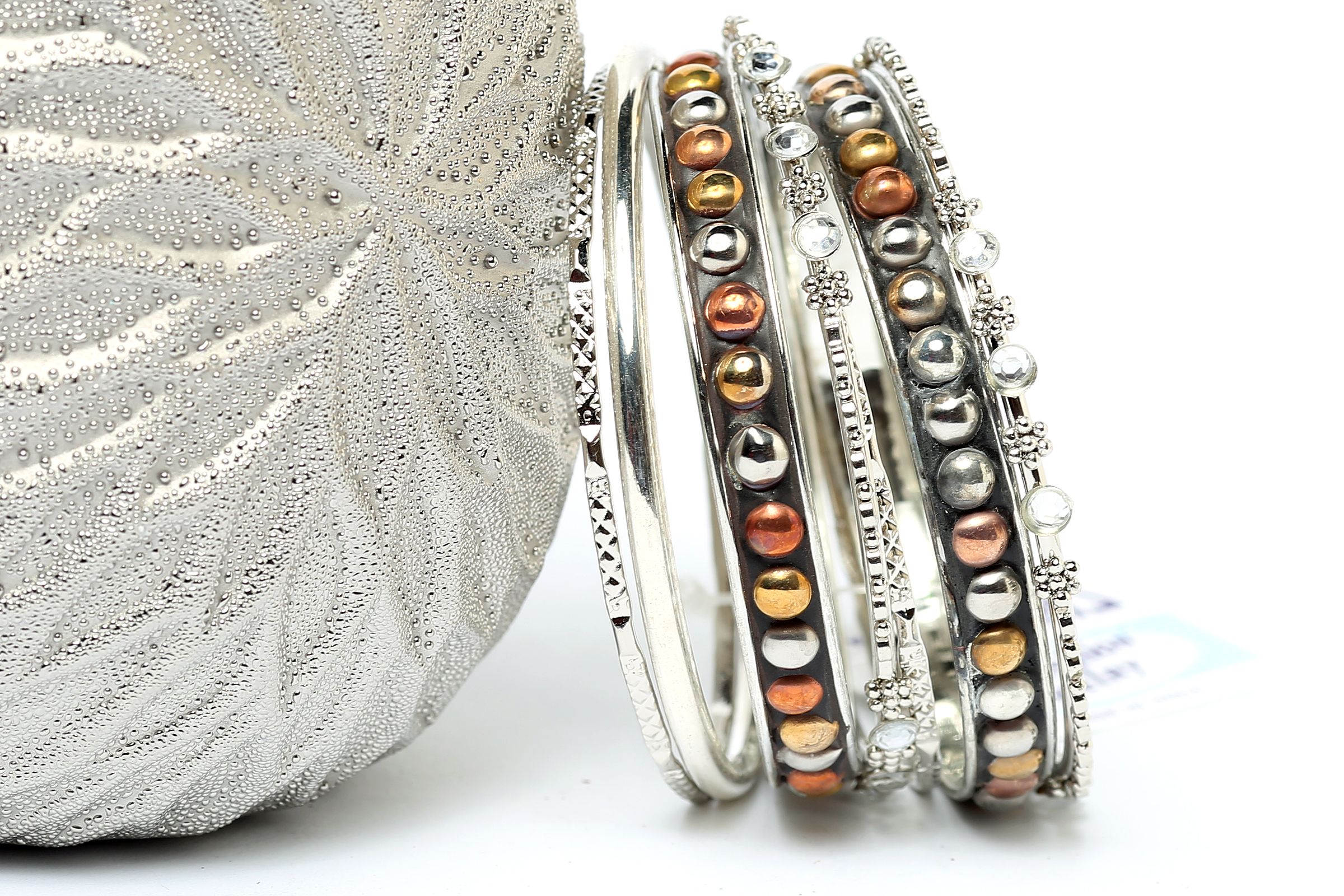 Trendy 7 pieces set of bangles in brass including 2 wide bangles with copper, silver, gold dots & 5 thin bangles which have their own metal pattern. Lightweight & durable to use.