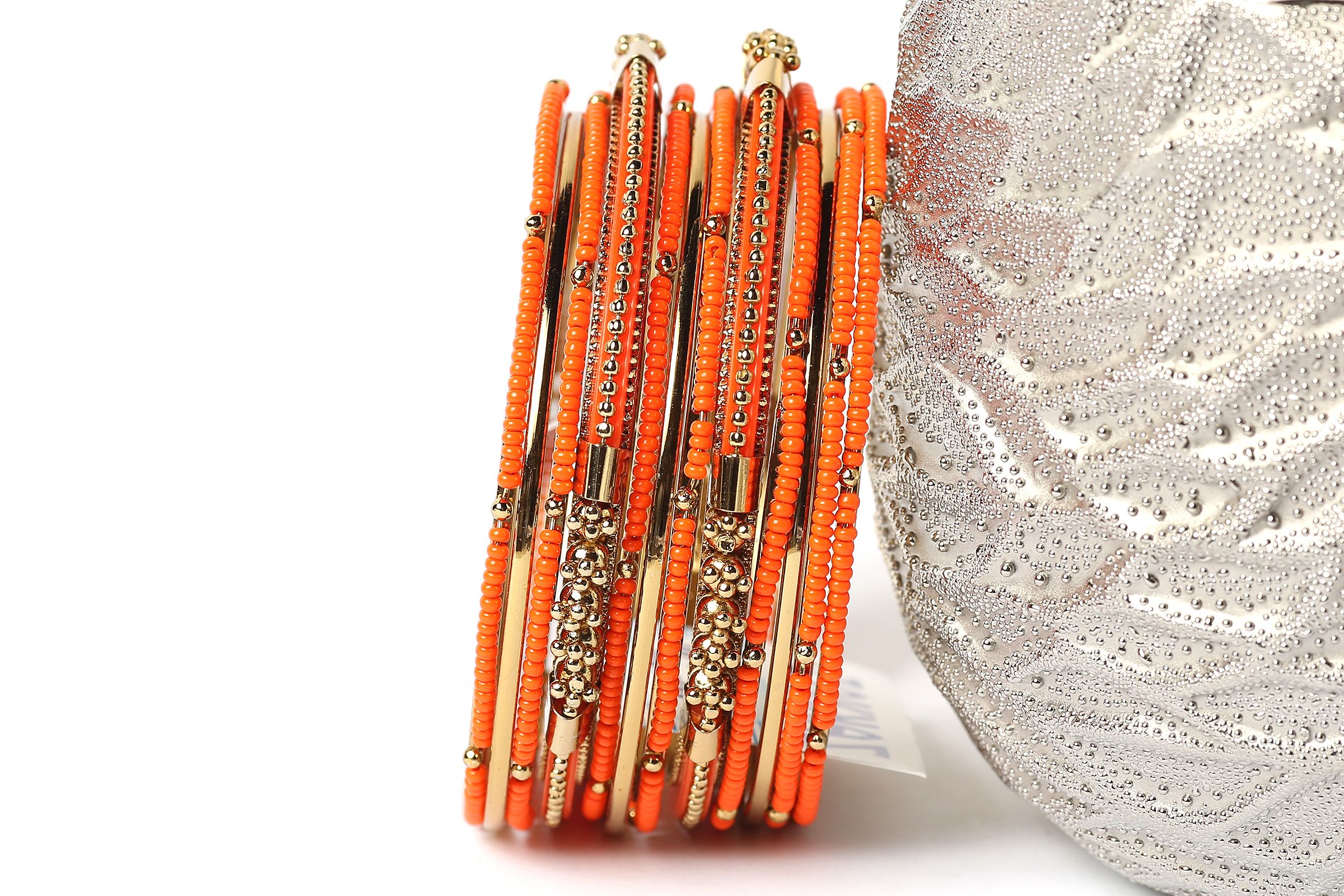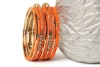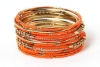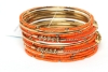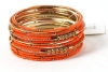 Bright colored elegant looking gold colored metal fashion bangles set of 12 pieces has small orange beads on 7 thin bangles, 3 thin gold colored bangles & 2 are resin bangles encrusted in patterned gold colored metal frame.
